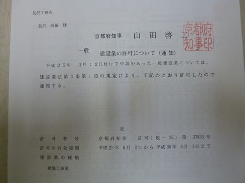 今年は5年に一回の建設業許可切り替え年 今年から決算書等の提出書類が増えまして少し手こずりましたが無事に下りました、これで5年間営めます。