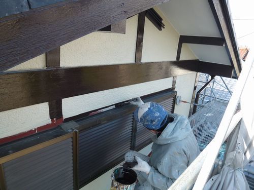 壁面には高耐候ウレタン樹脂塗料を2回塗、木部には保護塗料を、OPCのみなさん御苦労様です。